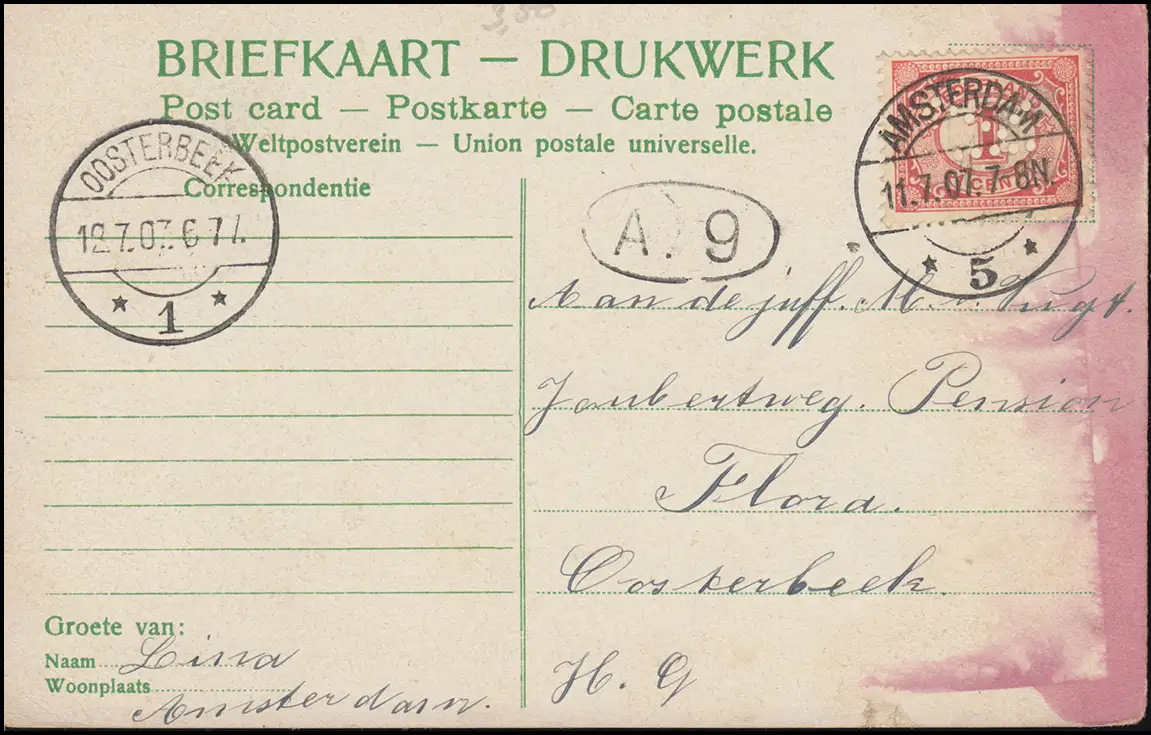 avec cachet d'arrivée OOSTERBECK 12.7.1907, carte rougeâtre selon le schéma Numéro de catalogue: 50 Examen: original Référence produit: 00000000024966