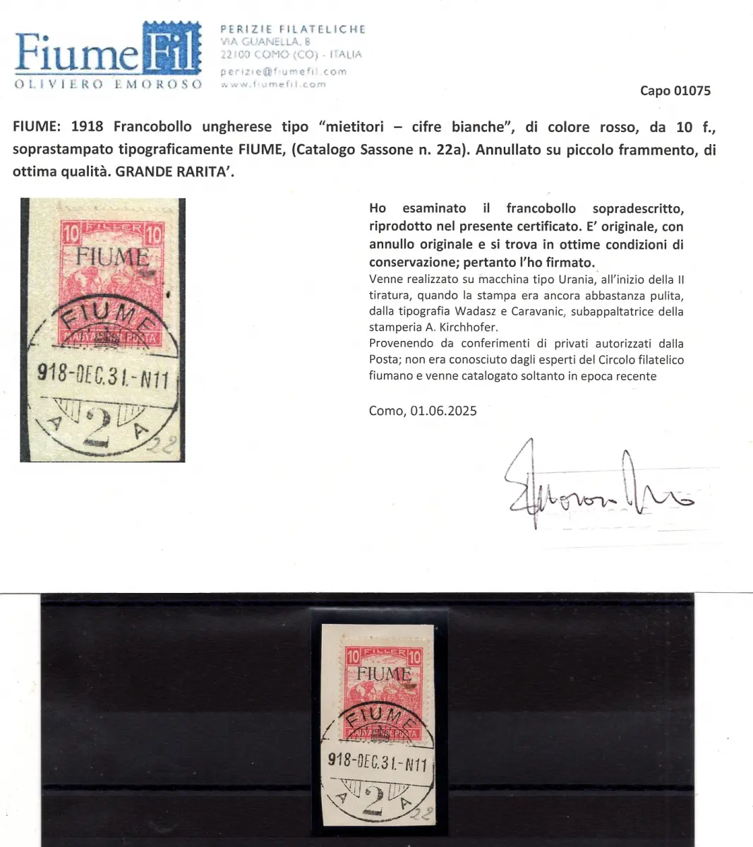 Fragment - Fluss - 10 f. rote Ernte Nr. 22. weiße Ziffern Druckaufdruck, gestempelt auf kleinem Fragment mit vollständiger Annullierung Fluss 31.12.18 - perfekt - Sehr selten, Zertifikat Oliviero Emoroso - Kat. euro 20000 Cod. 3289/WEB