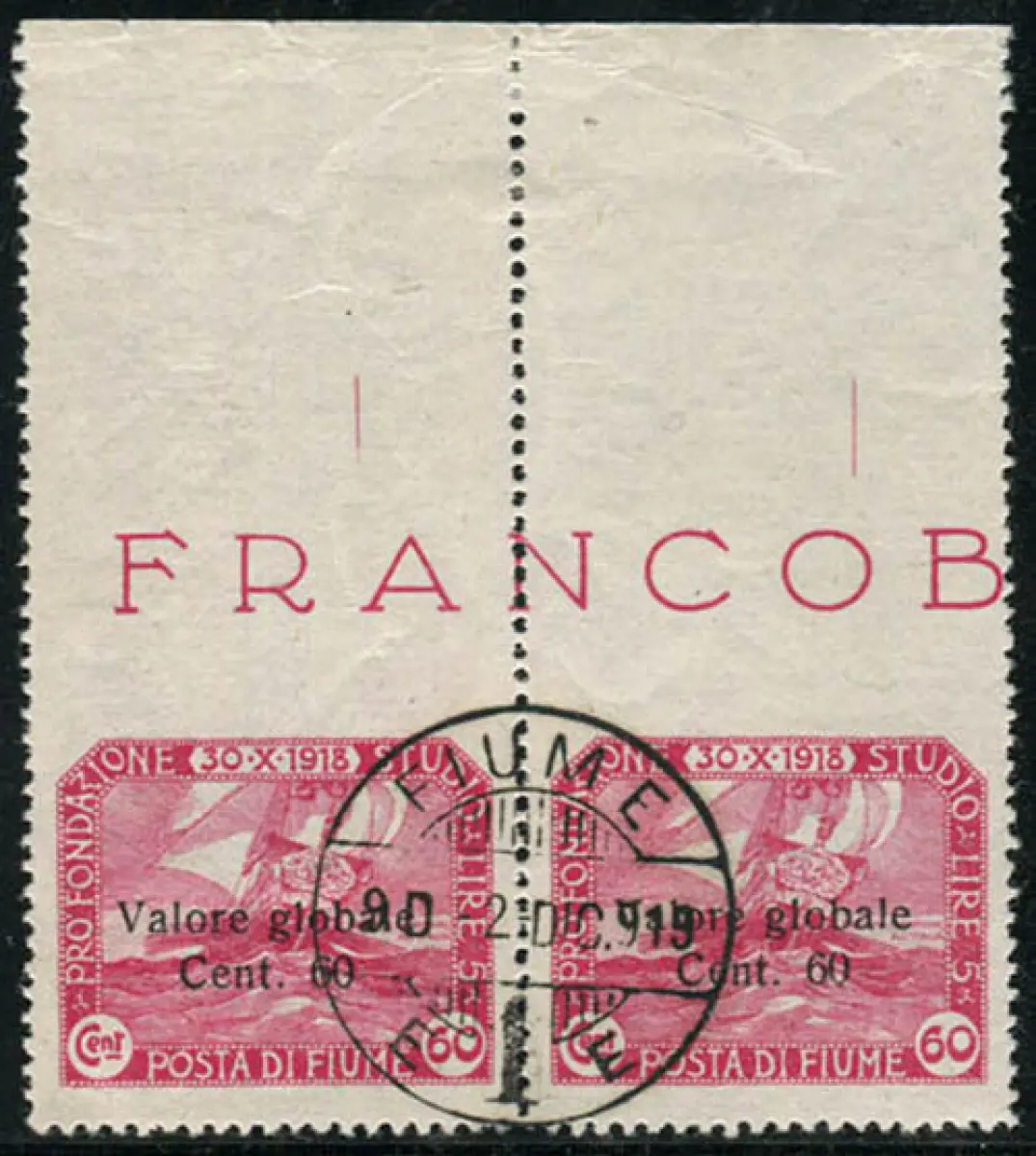 Fluss - Weltwert Cent. 60 Paar ungezähnt oben gebraucht - Fluss - Weltwert Cent. 60 n. 93l horizontales Paar ungezahnt oben b. von f. integral - Sehr schön - Kat. 440 Code 902/11
