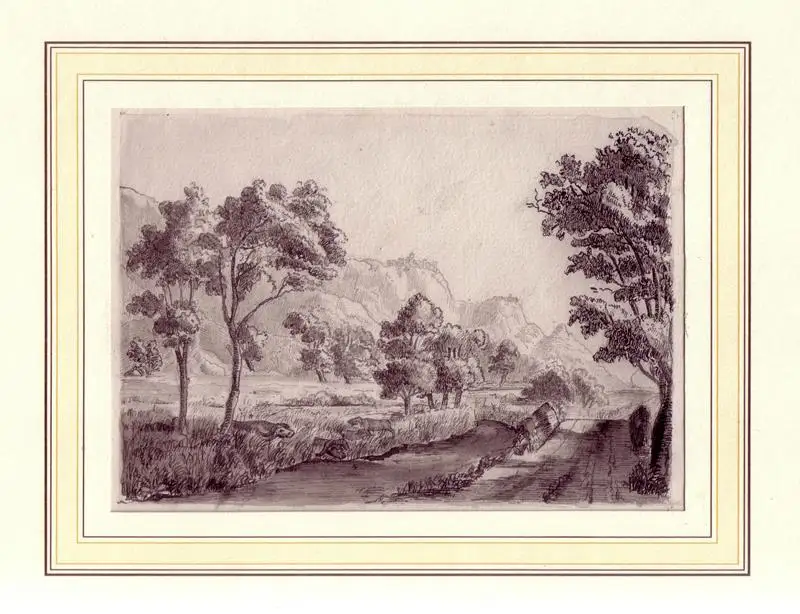 Lavierte Tuschzeichnung auf geripptem Bütten (Bildmaß: 14 x 16,5 cm, Blattmaß: 16 x 20,5 cm). Unter schlichtem Passepartour mit fünffacher Linienumrahmung