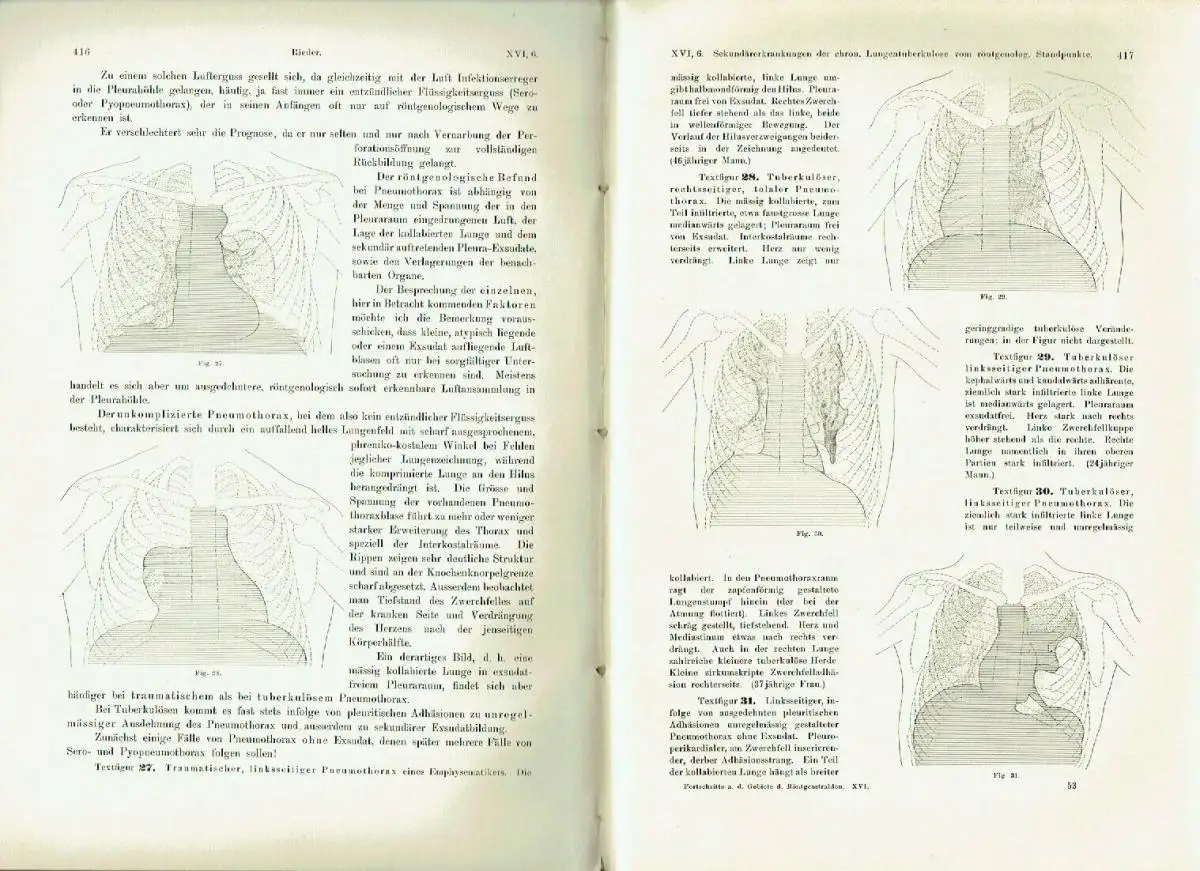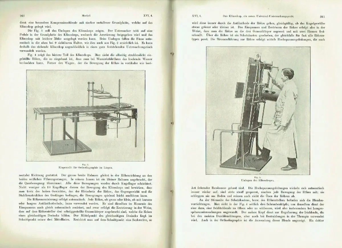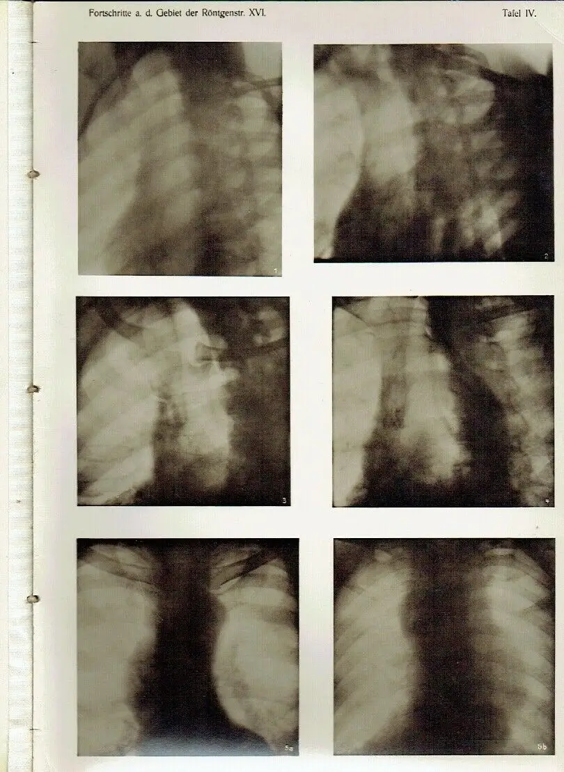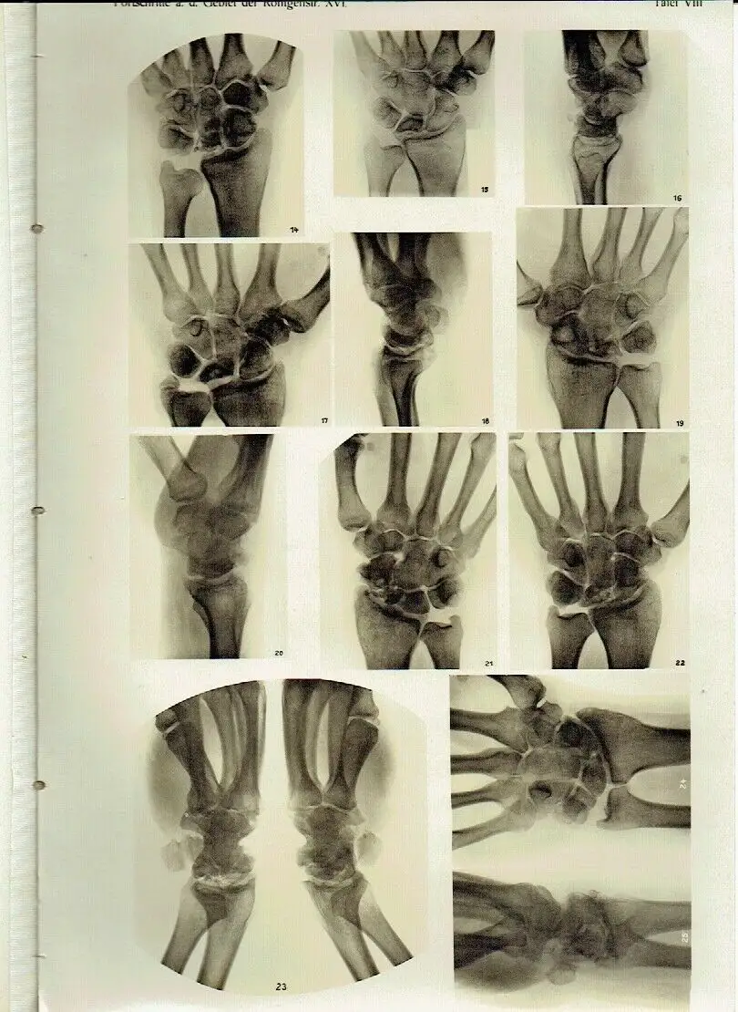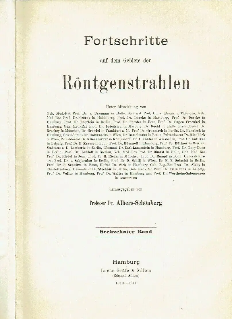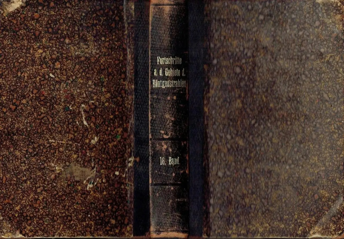 guter Zustand, geringe Gebrauchs- und Alterungsspuren: Einband etwas abgenutzt und beschabt - Leder an den Einbandecken durchgewetzt - Bindung leicht gelockert - Seiten sauber und ordentlich - Seiten teils etwas eselsohrig - 5 Seiten, davon 3 Bildtafeln mit kleinem Einriss / Dreiangel im senkrechten Rand, Rieder, H., Kavernen bei beginnender und bei vorgeschrittener Lungentuberkulose (Tafel I—III) - Rösler, A., Die Aorta thoracica im Röntgenbilde bei schräger Durchleuchtungsrichtung (Pos. 45°) (Tafel IV, V u. VI, Fig. 9b, 10a u. b) - Dietz, P. J. Ph., Die radioulnare Synostose, eine seltene angeborene Missbildung der Ellbogengegend (Tafel VI, Fig. a u. b) - Fritsch, K., Die „Tibia en laure de sabre" als Folge der erworbenen Lues des Erwachsenen (Tafel VI, Fig. c) - Jolasse, Über die mit der Röntgenuntersuchung des Magen-Darmkanals erzielten Resultate in anatomischer, physiologischer und pathologischer Beziehung - Peters, E., Die Wirkung lokalisierter in Intervallen erfolgender Röntgenbestrahlungen auf Blut, blutbildende Organe, Nieren und Testikel - Quiring, Bemerkung zu dem Aufsatz des Herrn Dr. Haenisch: „Über isolierte Aufnahme einer Kieferhälfte" in Band XV, Heft 6 dieser Zeitschrift - Kienböck, R., Über traumatische Malazie des Mondbeins und ihre Folgezustände: Entartungsformen und Kompressionsfrakturen (Tafel VII, VIII, IX u. X) - Kienböck, R., Über Luxationen im Bereiche der Handwurzel. - Dorsale Luxation der Hand in der perilunären Gelenkslinie und isolierte volare Luxation des Os lunatum - Dorsale Luxation der Mittelhand (Tafel XI) - Müller, Ein neuer Röntgenaufnahmeapparat - Amrein, P., Resultate bei operativer Pseudoarthrosen- und Frakturen-Behandlung mit Elfenbeinstiften (Tafel XII) - Nemenow, N., Ein seltener Fall pyelographisch dargestellter Verdoppelung des Nierenbeckens und des Ureters (Tafel XIII, Fig. 1-3) - Lotsy, G. 0., Radiographischer Nachweis einer Bursitis subdeltoidea (Tafel XIII, Fig. d) - Machado, V., Ein ungewöhnlich grosser Nierenstein (Tafel XIII, Fig. a, b u. c) - Haenisch, G. F, Röntgenologische Eindrücke auf einer Reise in den Vereinigten Staaten - Chilaiditi, D., Zur Frage der Hepatoptose und Ptose im allgemeinen im Anschluss an drei Fälle von temporärer, partieller Leberverlagerung (Tafel XIV u. Tafel XV, Fig. a) - Lilienfeld, A., Wie heilen die Brüche und Verrenkungen der Finger in der Kassenpraxis? (Tafel XV, Fig. 1-8) - Alwens, Ein Beitrag zur Röntgendiagnostik subphrenischer Prozesse (Tafel XVI, Fig. a) - Rösler, A., Zur Diagnostik der hochsitzenden Pulsionsdivertikel mittels des Röntgenverfahrens Tafel XVI, Taf. 1-5) - Hirsch, M., Eine besondere Form des Kahnbeinbruches im Röntgenbilde (Tafel XVII, Fig. 1-4) - Metzner und A. Schnee, Über Röntgenblitzaufnahmen (Tafel XVII, Fig. 7 u. 8) - Quiring, W., Ein neuer Apparat für orthodiagraphische Messungen - Kienböck, R., Über Blitzfiguren auf Röntgenplatten (Tafel XVII, Fig. 5 u 6) - Fraenkel, Eug., Über Wirbelgeschwülste im Röntgenbilde (Tafel XVIII, XIX, XX u. XXI) - Merkel, H., Das Klinoskop, ein neues Universal-Untersuchungsgerät - Hoffmann, K., Röntgenologische Grössenbestimmung des Magens (Vergleich der Aufblähungs- und Wismutfüllungsmethode) - Christen, Th., Einige Anwendungen der Absorptionsgesetze auf die Röntgentherapie - Albers-Schönberg, II., Beitrag zur Kasuistik des Lungen-Echinokokkus (Tafel XXII, Fig. 1 u. 2) - Erkes, F., Beitrag zur Röntgendiagnose traumatischer Lungenaffektionen (Tafel XXII, Fig. 3) - Schiller, H. und P. S. O'Donell, Induzierte Radioaktivität durch Röntgenstrahlen - Albers-Schönberg, II., Röntgenbestrahlung von Gartenerde - Algyogyi, II., Ein seltener Fall von Missbildung einer Oberextremität. Brachydaktylie mit Pero- und Ektrodaktylie (Tafel XXII, Fig. 4-6) - Wertheim-Salomonson, J. K. A., Milliampèremeter und Röntgenlicht - Bayreuther, W., Untersuchungen über den Einfluss der Röntgenstrahlen auf Eitererreger des Pferdes (Tafel XXIII) - u. a, Halbleder, ca. 20,5 x 29, 468 Seiten mit zahlreichen Bildern im Text und auf 31 Bildtafeln