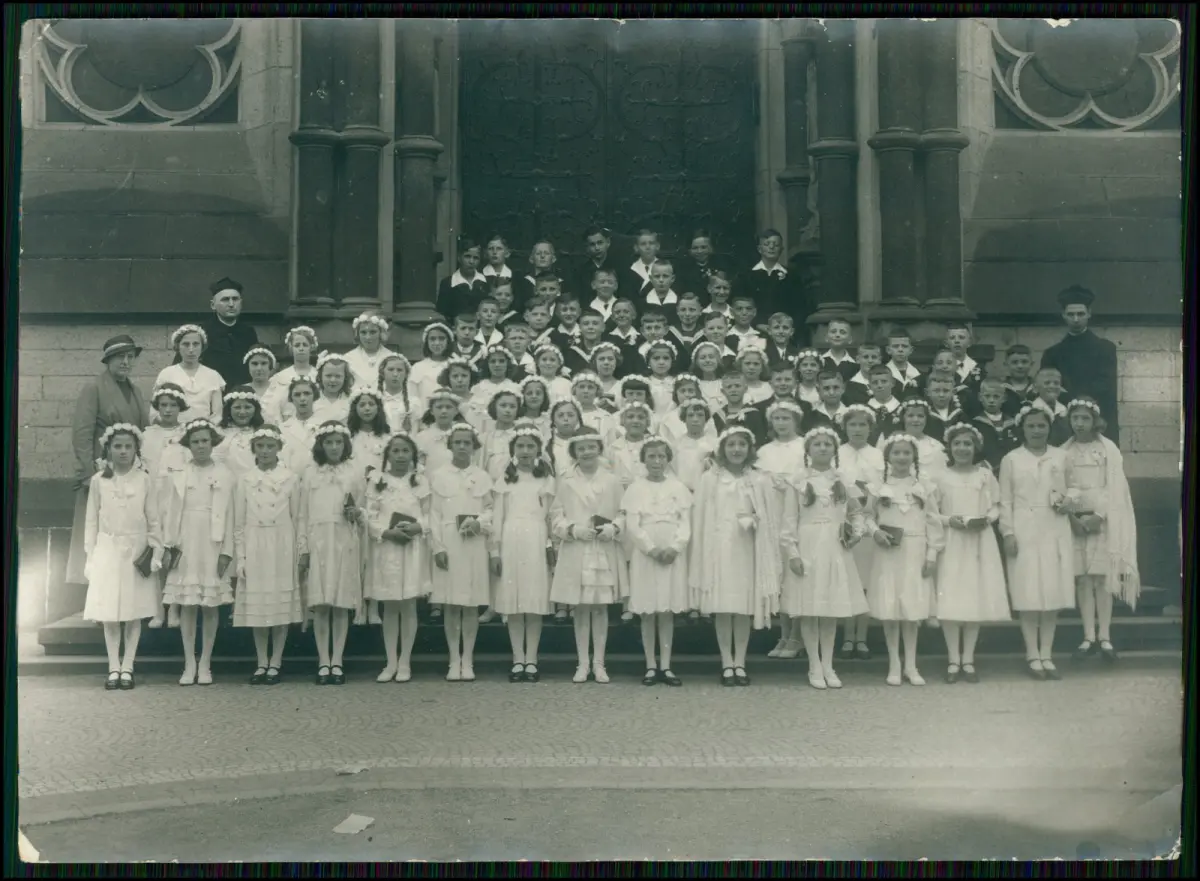 Foto 16x12cm- Ruhrgebiet Kinder Erstkommunion mit Geistlichen vor Kirchenportal