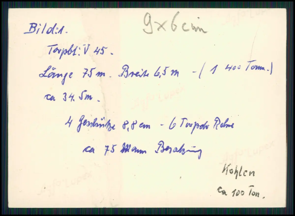 Handschriftliche technische Angaben zum Boot, Format 9×6 cm.