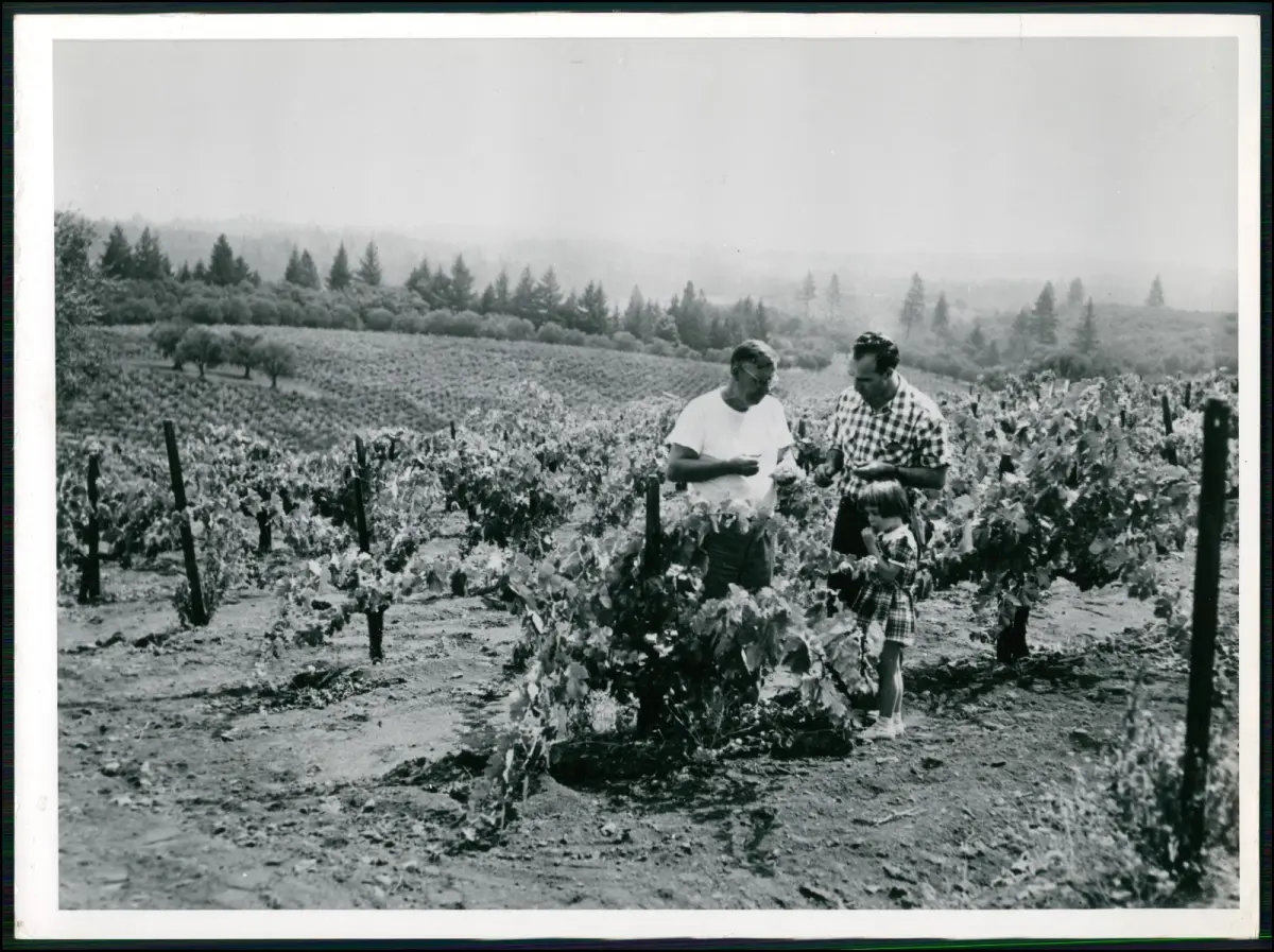 Foto 24x18cm Kalifornischer Weinberg Männer prüfen Trauben im milden Klima 1957