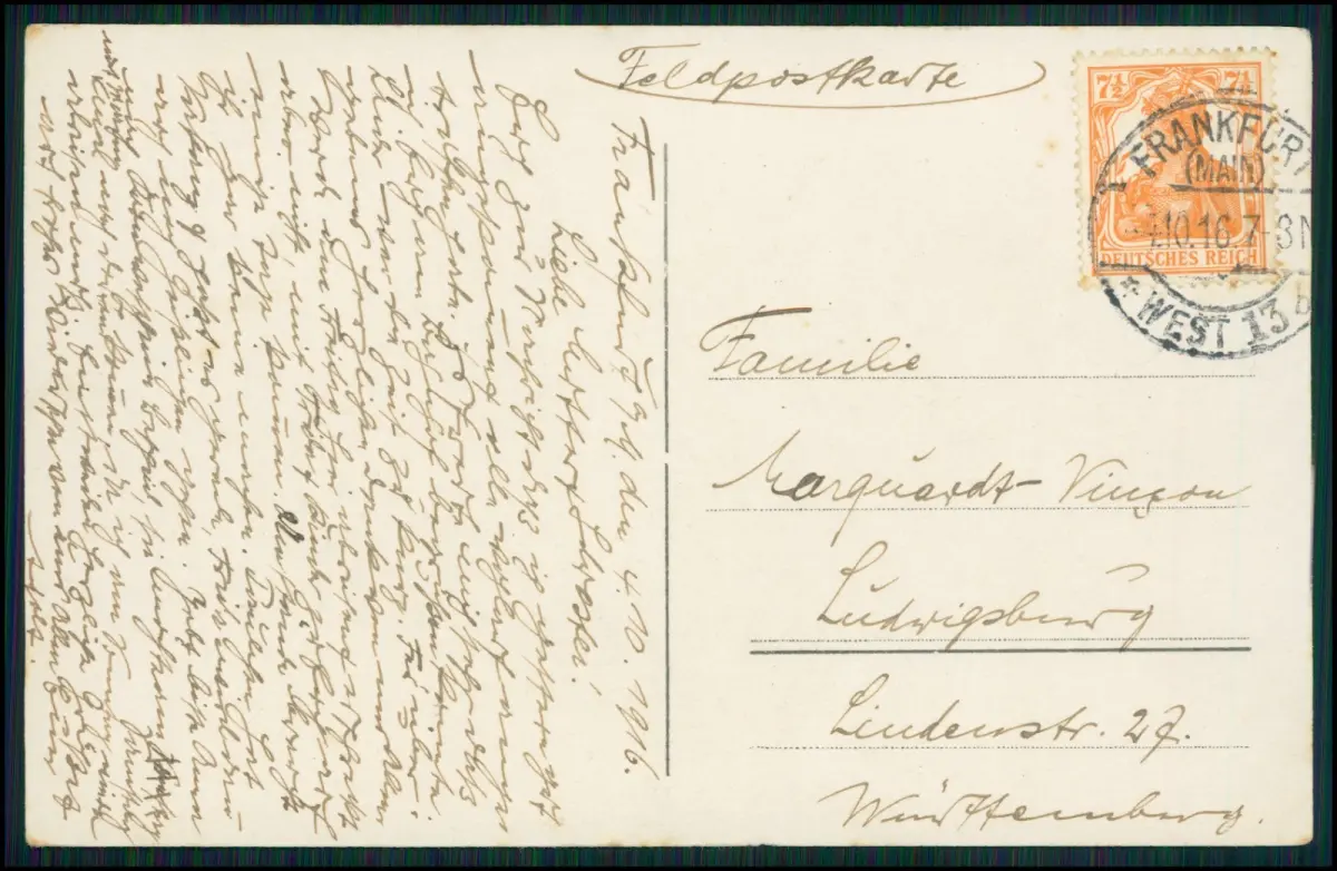 detailreiche Uniformstücke, Dienstgradabzeichen, Pickelhauben-Ersatzmützen und die klassische Atelierkulisse jener Epoche – ein geschätztes Motiv für Militaria-Sammler. Die zugehörige Feldpostseite ist vollständig beschrieben, adressiert nach Ludwigsburg, und trägt einen klar lesbaren Frankfurt Stempel vom 4.10.1916.