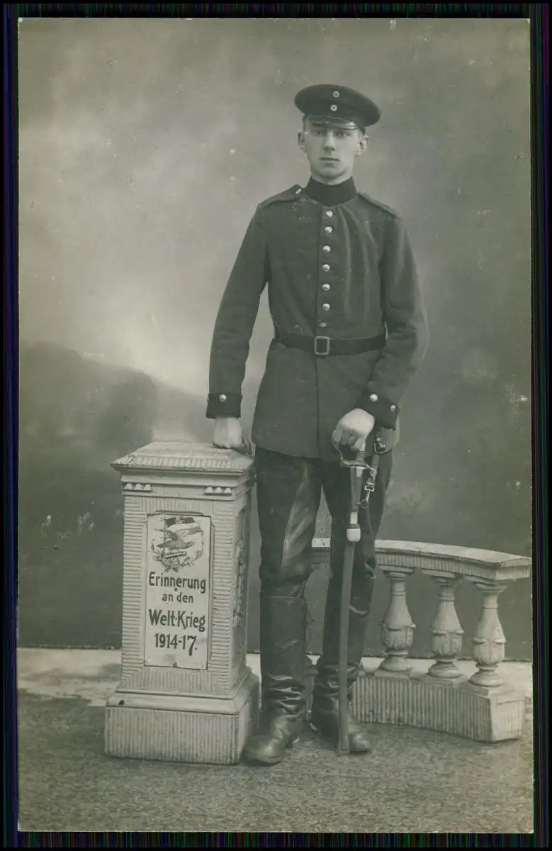 Foto AK 1. WK - Soldat Uniform im Atelier - Erinnerung an den Welt-Krieg 1914-17