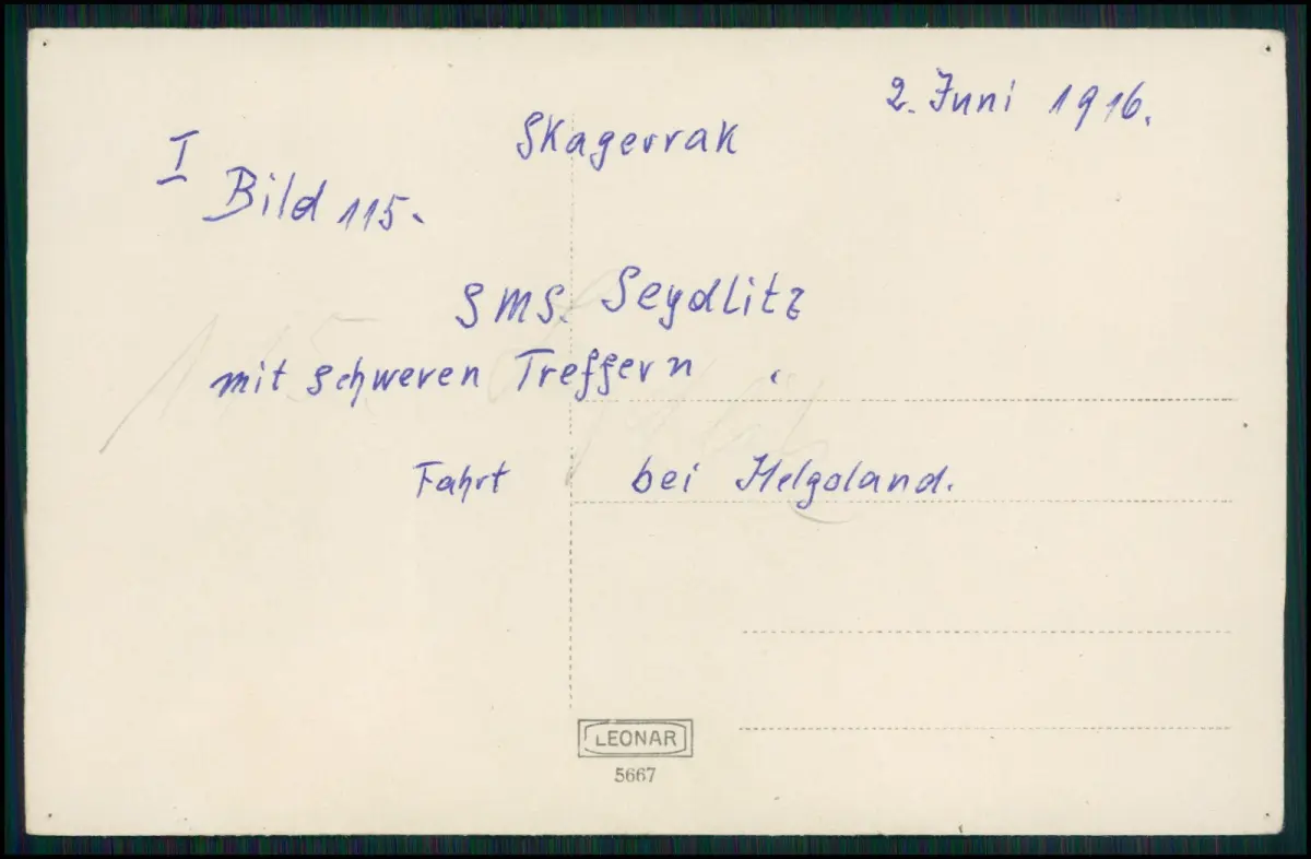 Datierung 2. Juni 1916, handschriftlicher Hinweis auf Skagerrak, schwere Treffer, Fahrt bei Helgoland.