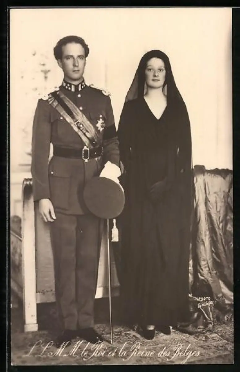 Foto-AK Astrid von Belgien in schwarz und der König in Uniform