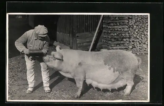 Foto-AK Bauer beim Füttern einer trächtigen Sau