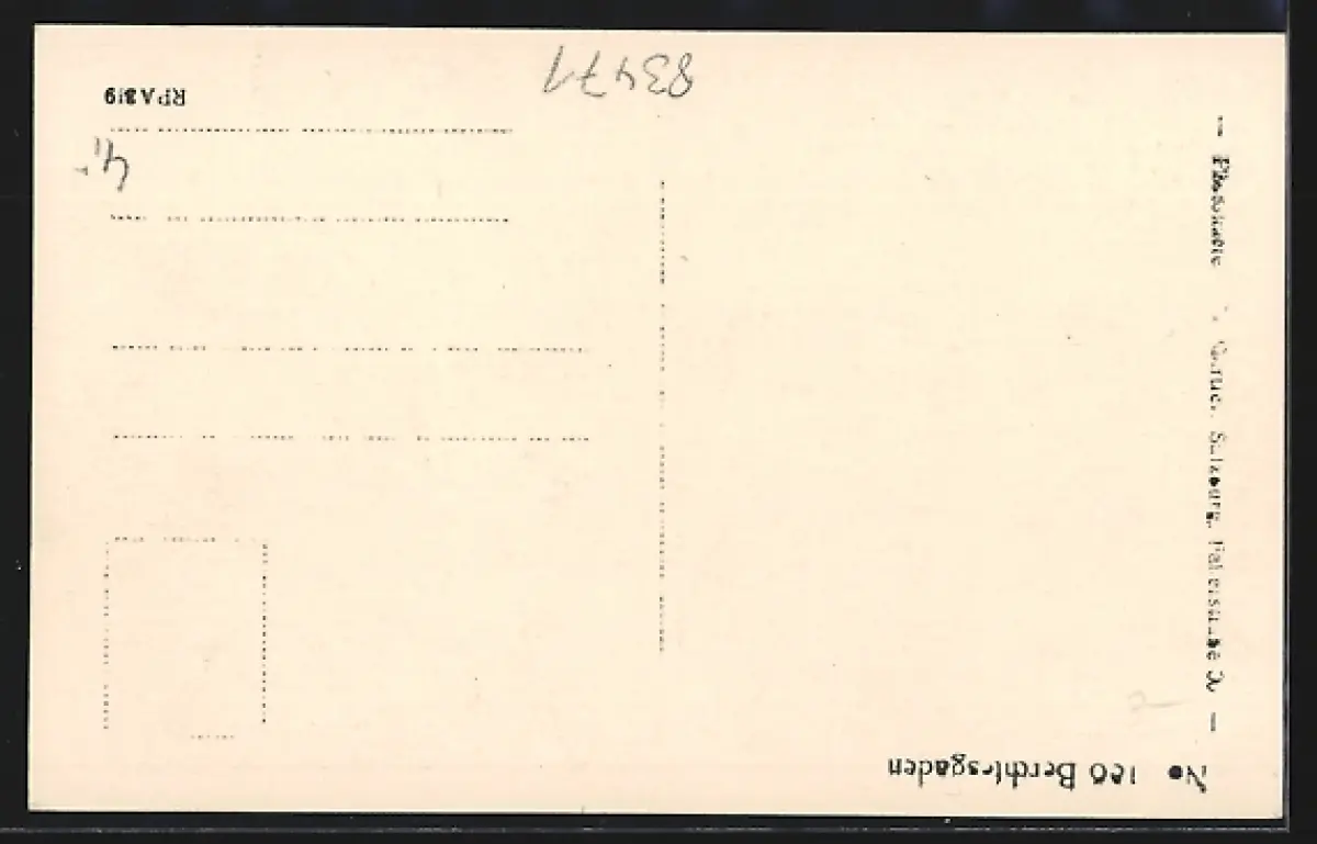 Personenbezogene Daten auf der Rückseite der Karte wurden durch blauen Textmarker unkenntlich gemacht. Die blauen Stellen sind auf die Vorderseite durchgeweicht und wirken sich negativ auf das Postkartenfoto aus