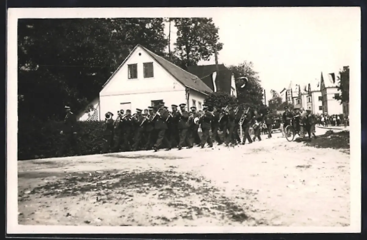 Foto-AK Chvalkovice, Militar-Musik-Parade auf einer Strasse, Haus mit Fahnen