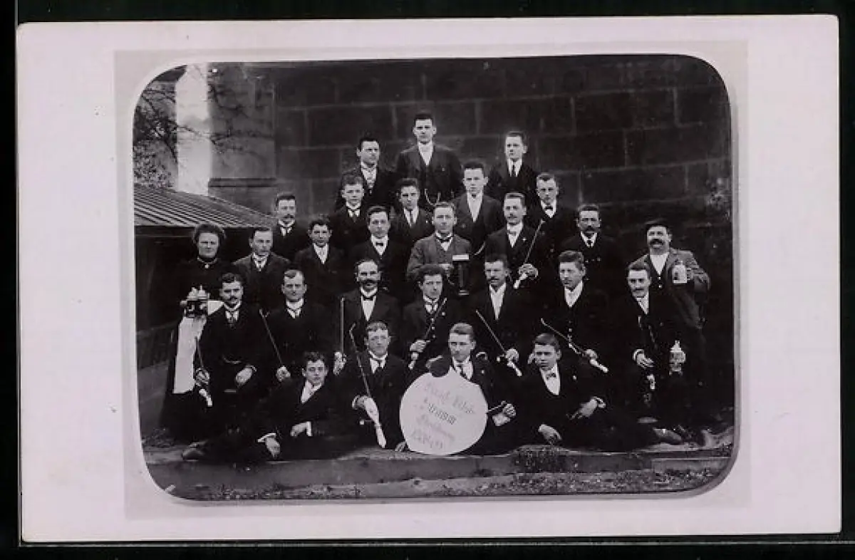Foto-AK Eberschwang, Rauchklub Stramm 1908/1909, Gruppenfoto von Männern mit Pfeifen