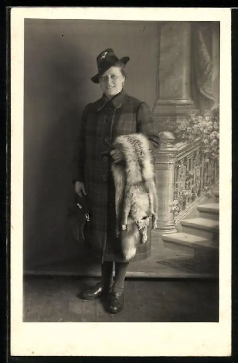 Foto-AK Frau im karierten Mantel mit Fuchspelz