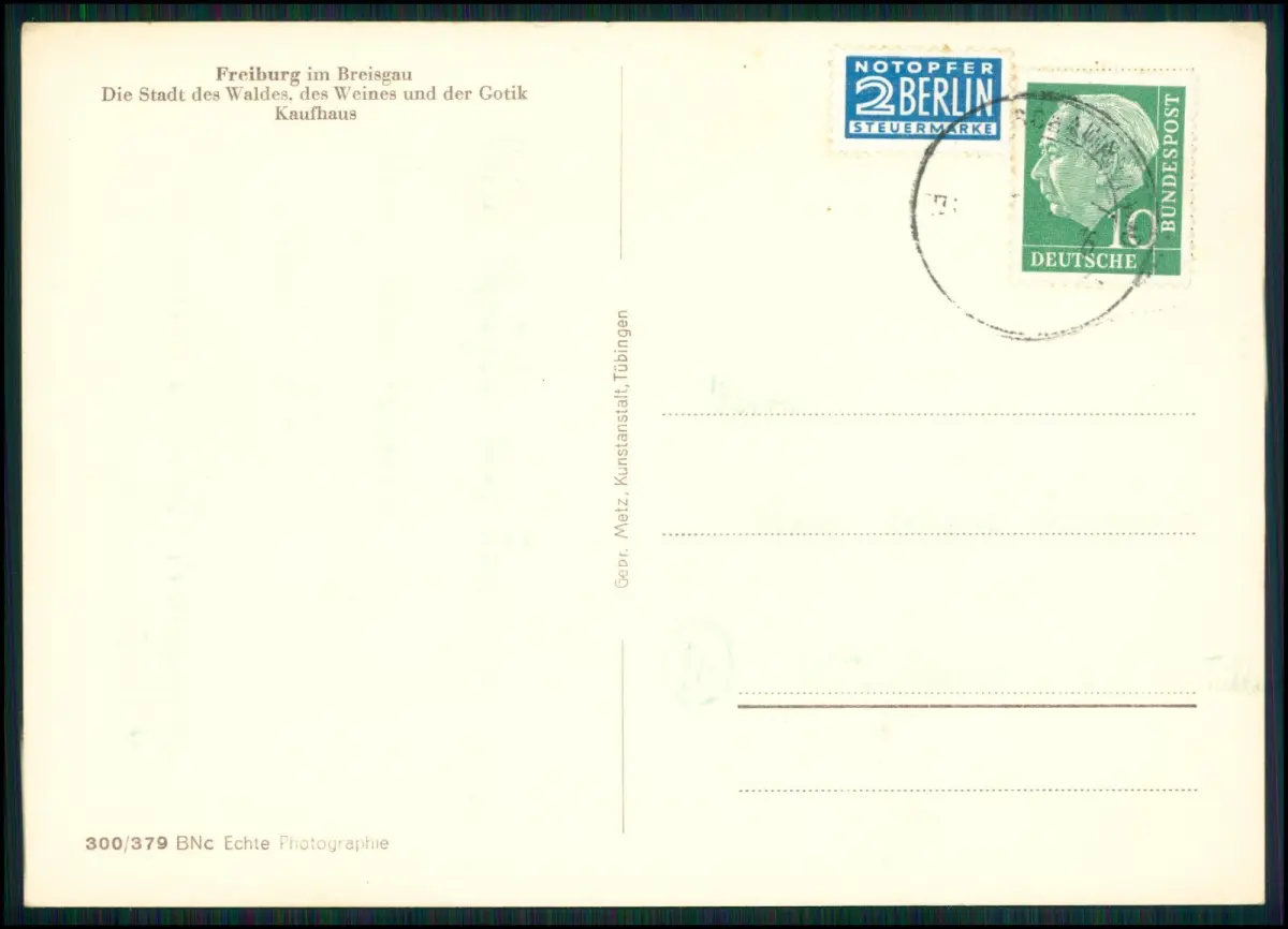 Motivdetails: Historisches Kaufhaus mit spätgotischer Fassadenarchitektur Ziergiebel, Erker, Maßwerkfenster – typisch für Freiburger Gotik Säulenhalle mit aufwendig verzierten Pfeilern Täglicher Wochenmarkt mit Sonnenschirmen und Verkaufswagen Hintergrundinformation: Rückseite: Unbeschrieben Poststempel teilweise lesbar (ca. 1950er Jahre) Frankatur: 10 Pf Heuss-Marke + Berlin-Steuermarke Verlag: Gebr. Metz Kunstanstalt Tübingen Seriennummer: 300/379 BNc – Echte Photographie