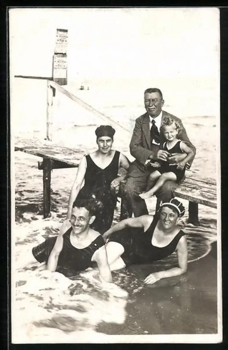 Foto-AK Gruppenfoto mit Kind an einem Steg