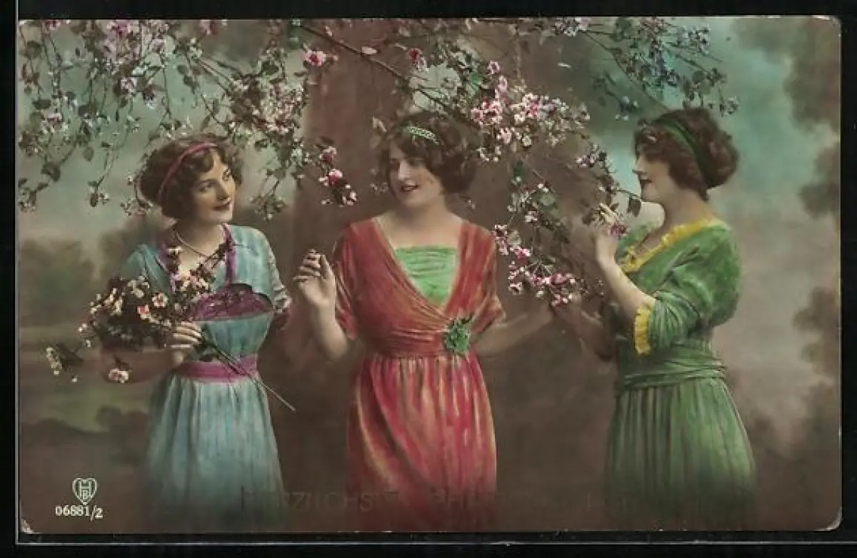 Foto-AK HB Nr. 06881/2: Drei Damen unter einem Baum in voller Blüte