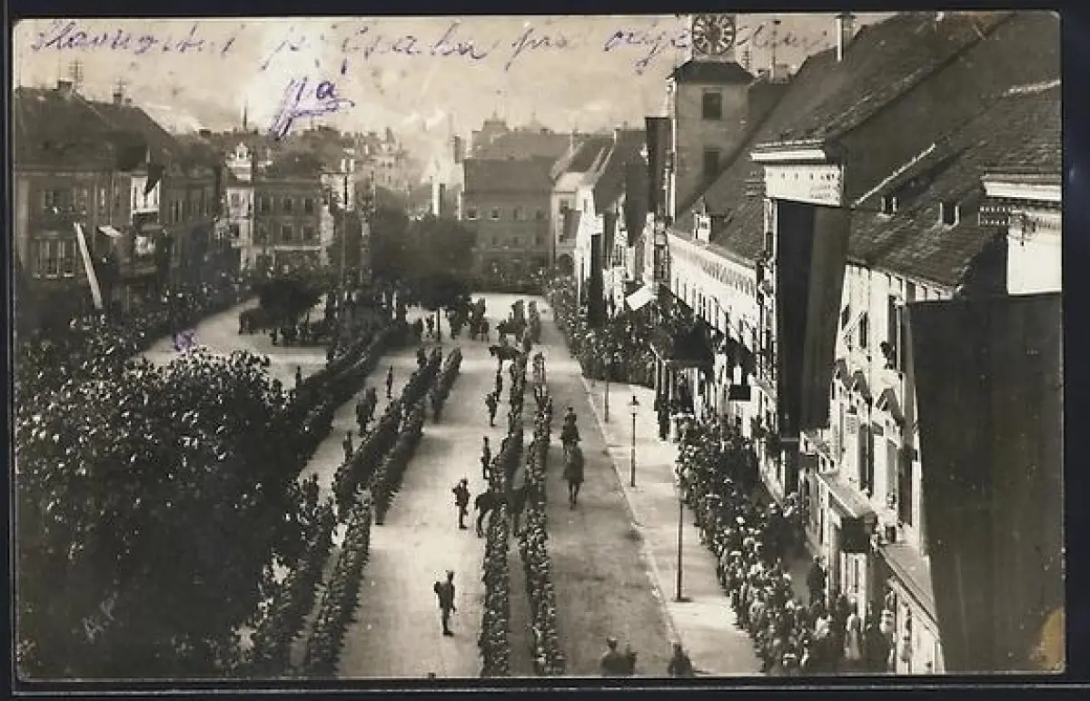 Foto-AK Leoben, Militär-Aufmarsch mit Pferden und Menschenmenge auf einem Platz mit Denkmal
