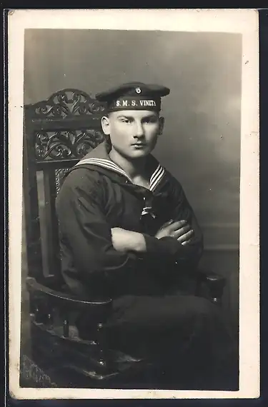 Foto-AK Matrose mit Mützenband Kriegsschiff SMS Vineta