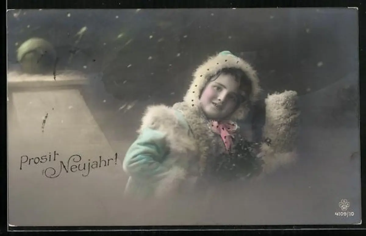 Foto-AK RPH SBW Nr. 4109/10: Mädchen im Mantel bei Schneefall, Neujahrsgruss