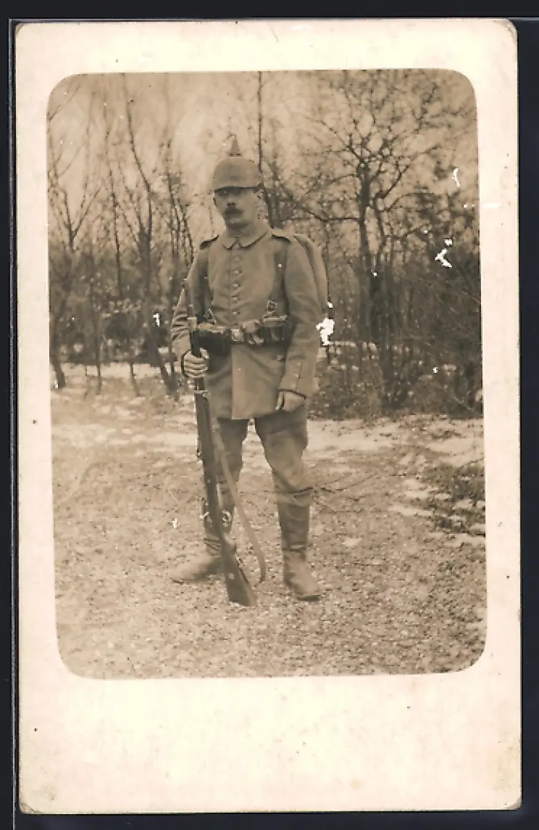 Foto-AK Soldat in Feldgrau Uniform mit Marschausrüstung, Pickelhaube und Gewehr