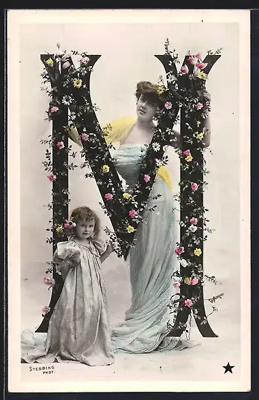 Foto-AK Stebbing: Buchstabe M mit Blumenschmuck, Frau und kleinem Mädchen