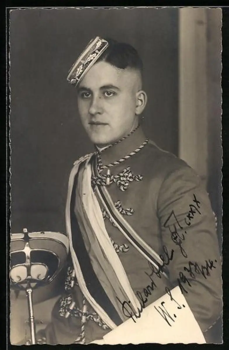 Foto-AK Student mit Tönnchen und Schläger, studentische Szene