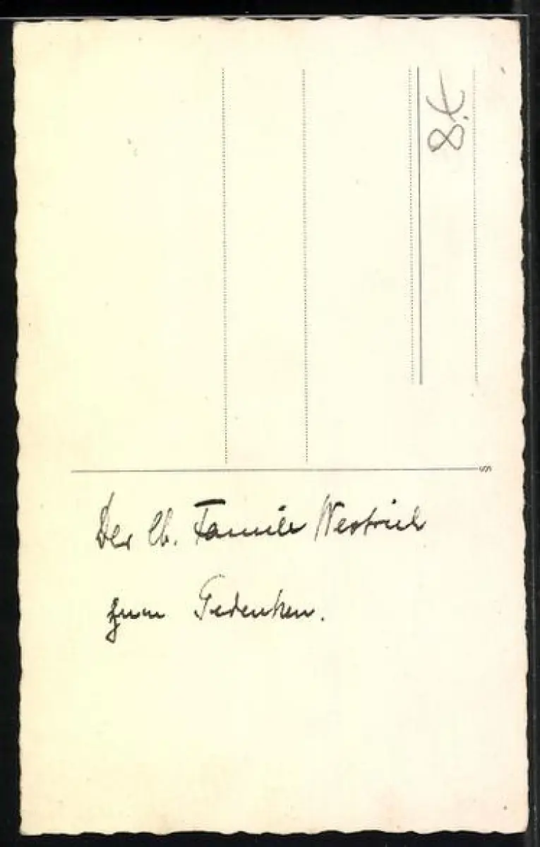 Personenbezogene Daten auf der Rückseite der Karte wurden durch blauen Textmarker unkenntlich gemacht. Die blauen Stellen sind auf die Vorderseite durchgeweicht und wirken sich negativ auf das Postkartenfoto aus