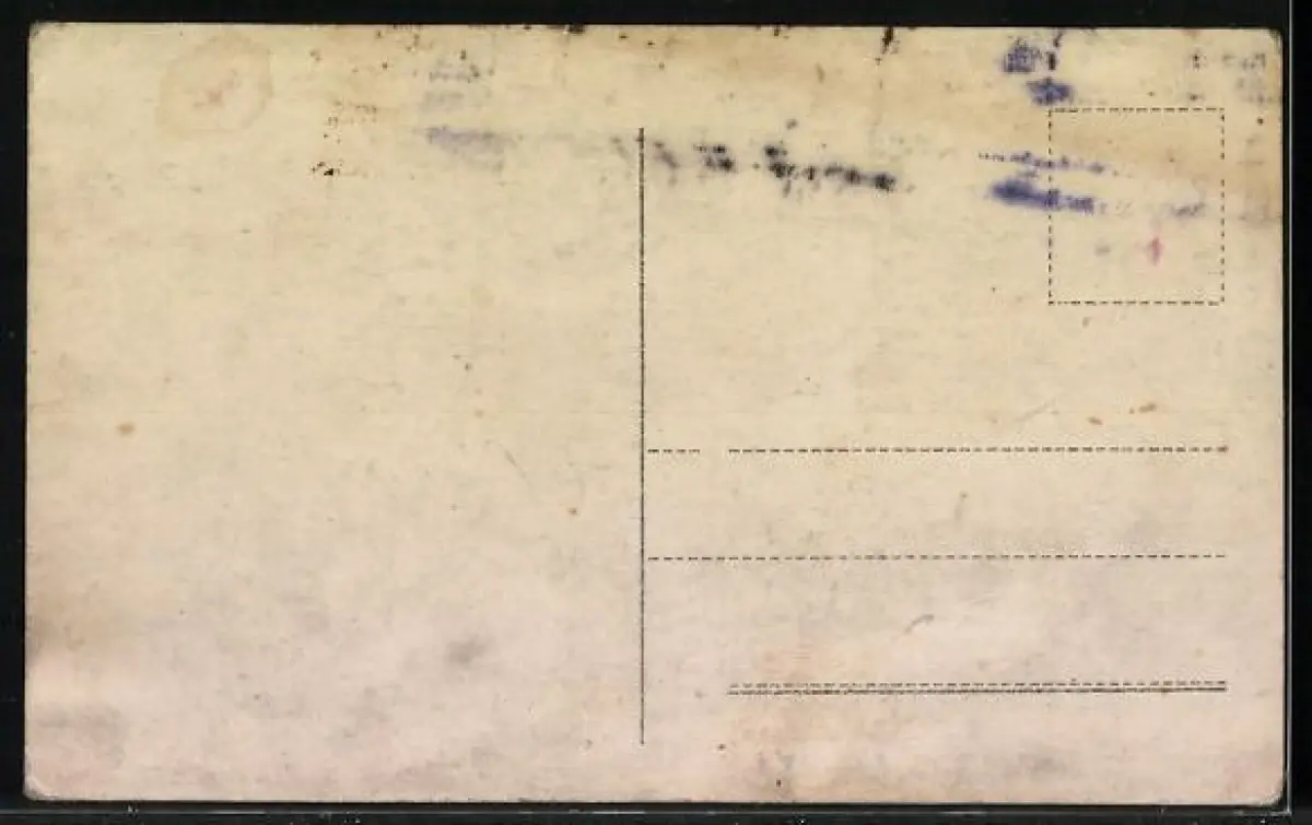Personenbezogene Daten auf der Rückseite der Karte wurden durch blauen Textmarker unkenntlich gemacht. Die blauen Stellen sind auf die Vorderseite durchgeweicht und wirken sich negativ auf das Postkartenfoto aus