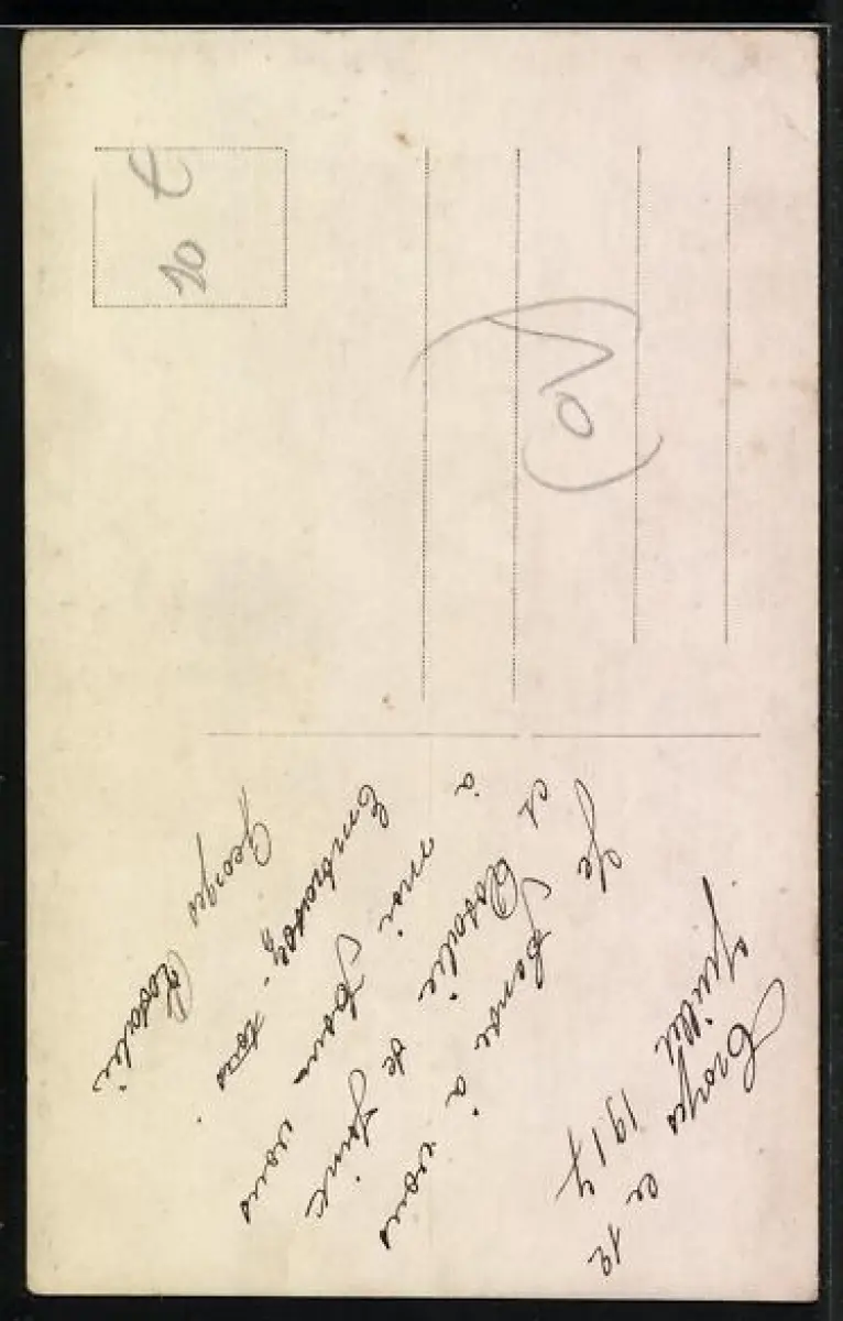 Personenbezogene Daten auf der Rückseite der Karte wurden durch blauen Textmarker unkenntlich gemacht. Die blauen Stellen sind auf die Vorderseite durchgeweicht und wirken sich negativ auf das Postkartenfoto aus