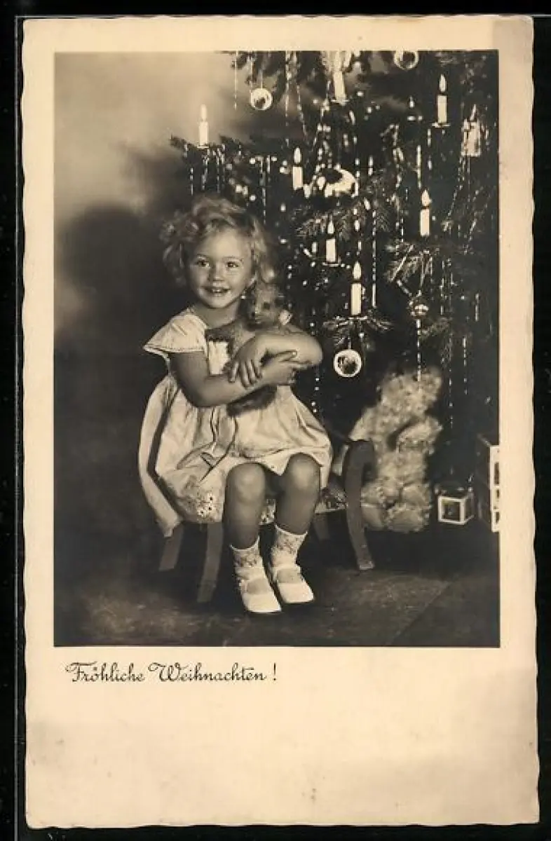Foto-AK Weihnachtsgruss, Mädchen mit Teddy und Weihnachtsbaum