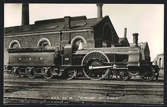 Foto-AK englische Eisenbahn, G. N. R., No. 69, Stirling, 8 Ft., Single, Dampflokomotive mit Tender