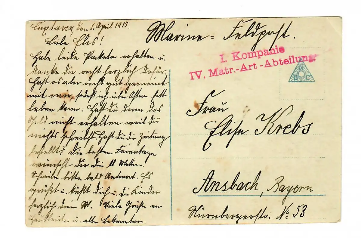 Photos Cartes de vue Marine: 1915 IV Matr. Art. Département d'Ansbach