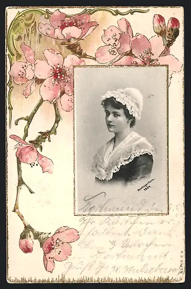 Foto-Collage-AK Damenporträt mit Haube, Kirschblüten-Passepartout
