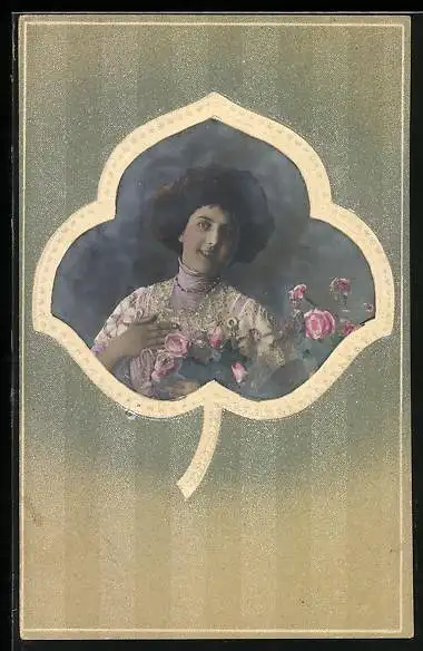 Foto-Collage-AK Porträt einer Frau mit Blumen im Passepartout