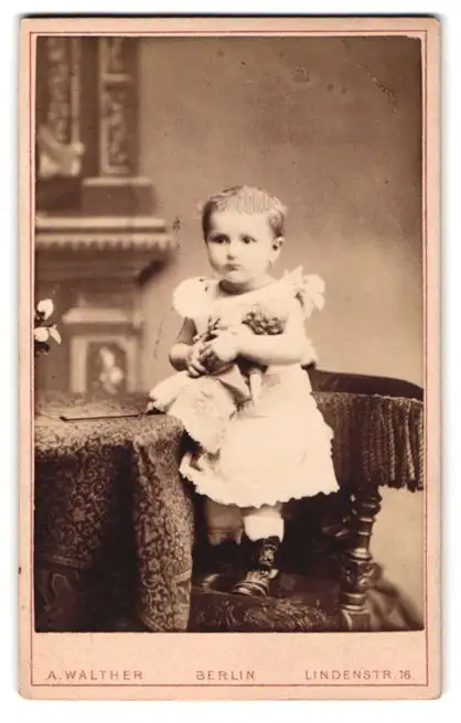 Dieses anmutige CDV-Fotoporträt zeigt ein kleines Kind, das behutsam eine Puppe umarmt. Das Kind steht auf einem kunstvoll verzierten Stuhl und trägt ein feines, weißes Kleid, das detailreich mit Rüschen besetzt ist. Die Szenerie wird durch einen reich dekorierten Hintergrund ergänzt, der dem Bild eine elegante Atmosphäre verleiht. Ein zarter Tisch mit einem Blumentopf und einer Tischdecke vervollständigt diese liebevolle Komposition., guter Zustand