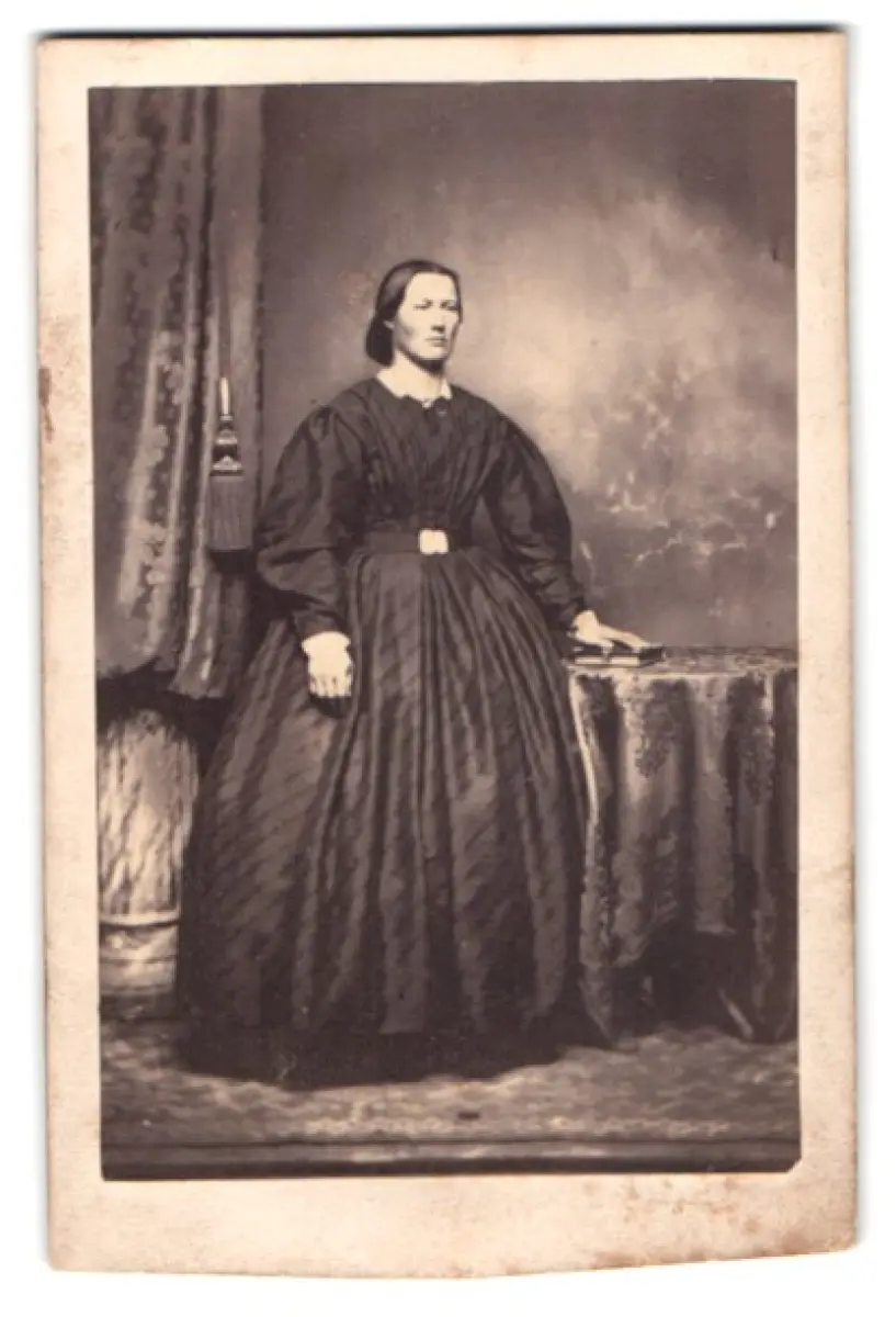 Diese CDV Fotografie zeigt eine ernst dreinblickende Dame, die in einem eindrucksvollen, langen Kleid posiert. Sie steht anmutig neben einem mit Stoff bedeckten Tisch, ihre Hand leicht darauf ruhend. Der Hintergrund wird von einem schweren Vorhang und einer dezenten Wand gebildet, was der Szene eine formelle und zeitlose Atmosphäre verleiht., guter Zustand