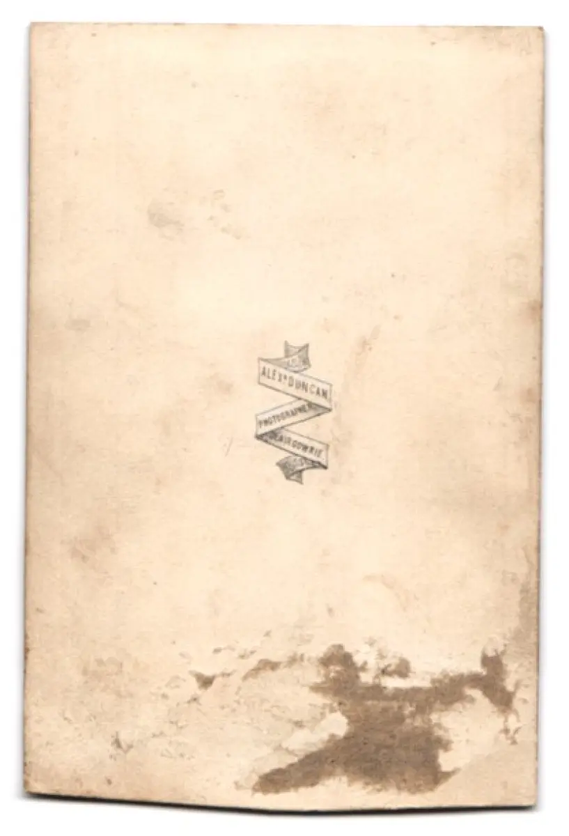 Diese CDV Fotografie zeigt eine ernst dreinblickende Dame, die in einem eindrucksvollen, langen Kleid posiert. Sie steht anmutig neben einem mit Stoff bedeckten Tisch, ihre Hand leicht darauf ruhend. Der Hintergrund wird von einem schweren Vorhang und einer dezenten Wand gebildet, was der Szene eine formelle und zeitlose Atmosphäre verleiht., guter Zustand Größe ca. 6,5 x 10,0cm