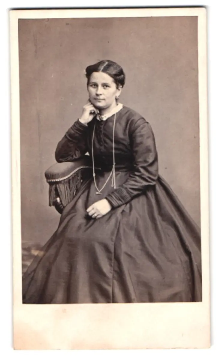 Diese CDV Fotografie offenbart das Porträt einer Frau, die in einem langärmeligen, dunklen Kleid mit auffälligem Kragen sitzt. Ihr Haar ist sorgfältig frisiert, und sie trägt eine lange Kette um den Hals. Die Dame hat ihren Arm lässig auf einer Armlehne mit dekorativen Fransen platziert, was ihrer Haltung eine gewisse Anmut verleiht. Ihr Blick richtet sich direkt nach vorne und strahlt Ruhe und Selbstbewusstsein aus., guter Zustand