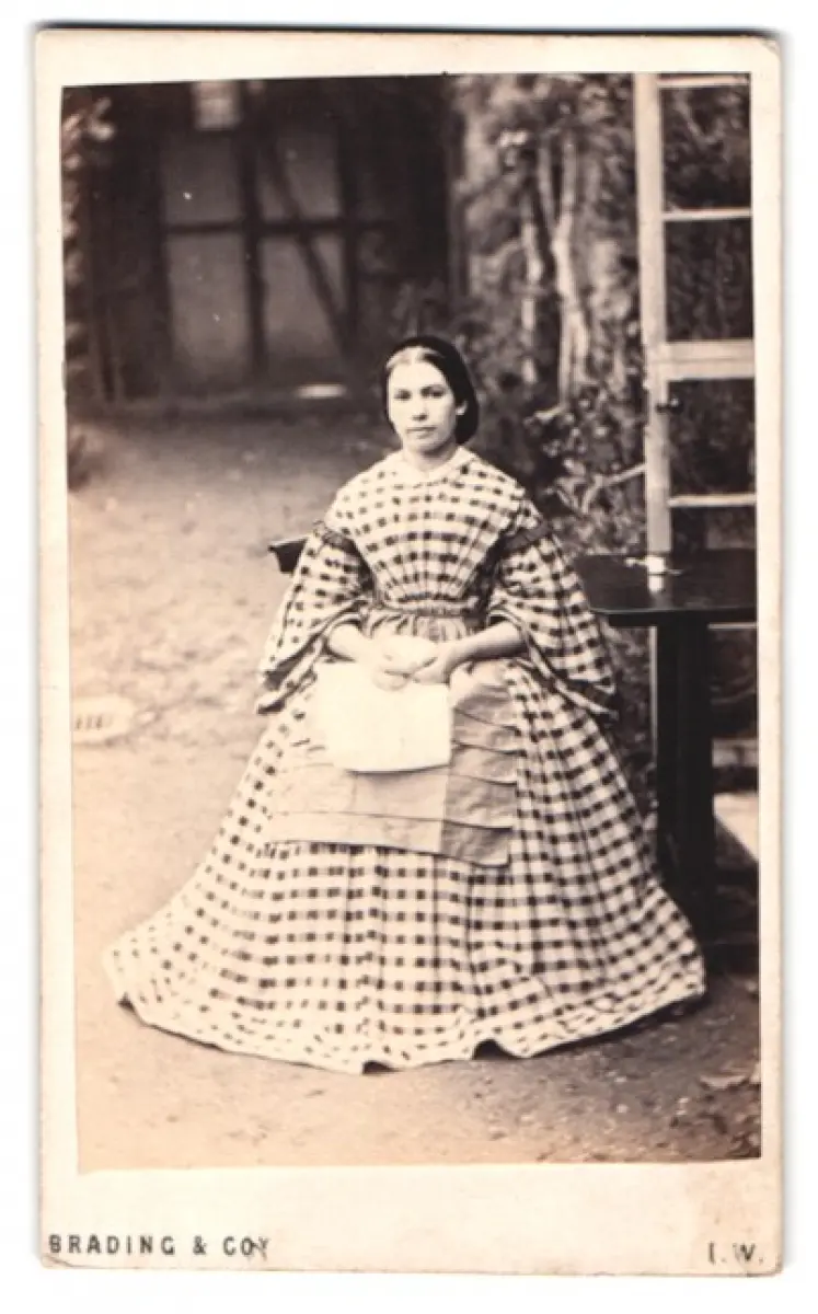 Fotografie Brading & Co., Newport / I.W., junge Engländerin im karierten Kleid mit Schürze