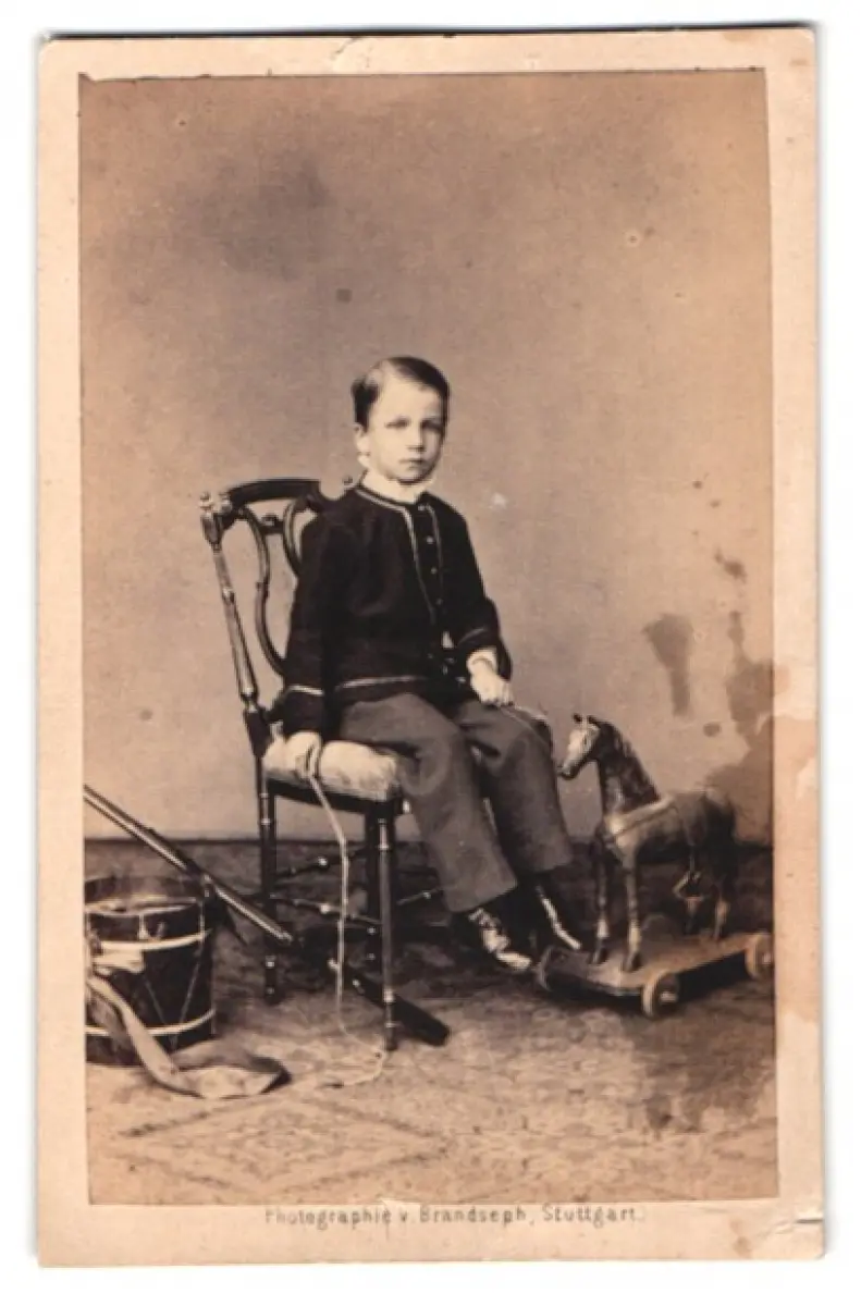 Fotografie Brandseph, Stuttgart, junger Knabe im Anzug mit Holzspielzeug Pferd und Gewehr samt Trommel