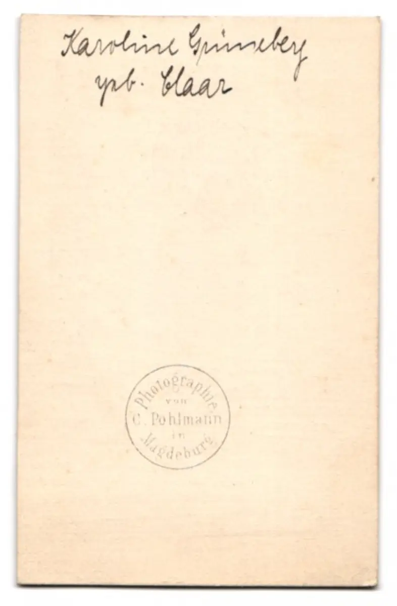 Fotografie C. Pohlmann, Magdeburg, Portrait junge Frau Karoline Grünberg geb. Claar im dunklen Kleid