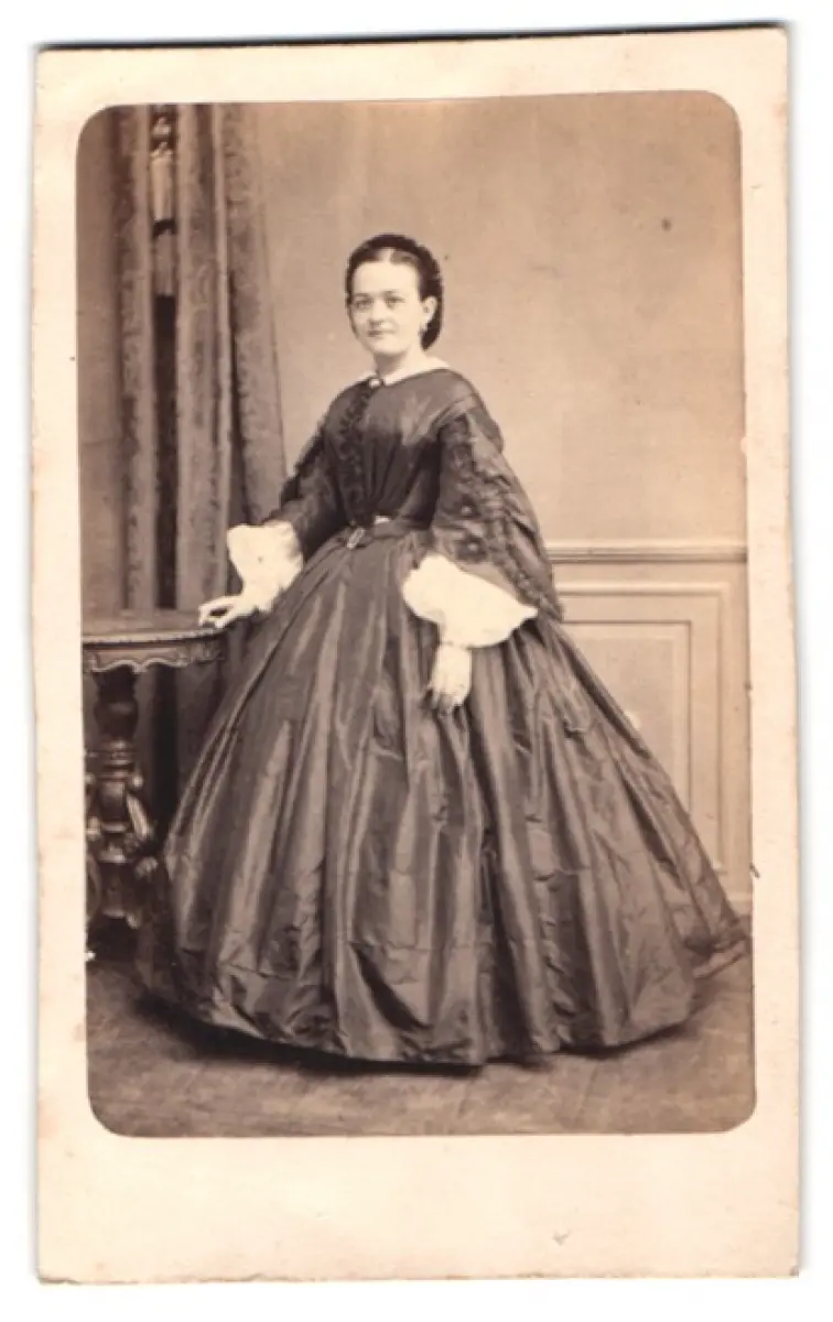 Diese CDV Fotografie zeigt eine Dame in einer beeindruckenden, voluminösen Robe des 19. Jahrhunderts. Ihr Kleid besticht durch aufwendige Verzierungen und weite Ärmel aus feinem Stoff. Sie steht neben einem kunstvoll gearbeiteten Tisch und blickt selbstbewusst in die Kamera. Der Hintergrund ist mit einem dezenten Vorhang und einer schlichten Wandverkleidung gestaltet, was das elegante Erscheinungsbild der Dame zusätzlich unterstreicht., guter Zustand