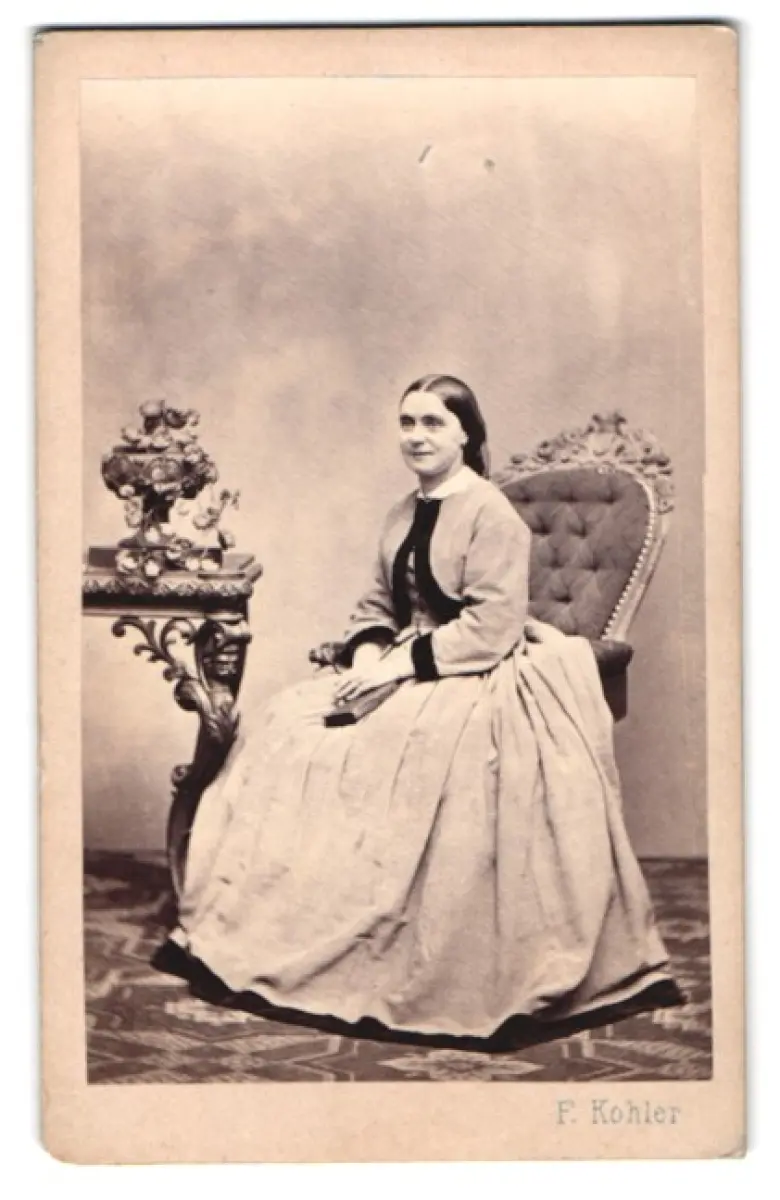 Diese CDV Fotografie fängt eine elegante Dame in einem detailreichen viktorianischen Kleid ein, die auf einem reich verzierten Stuhl Platz genommen hat. Neben ihr steht ein kunstvoll gestalteter Tisch, auf dem ein üppiges Blumenarrangement thront. Die Szene strahlt eine ruhige Anmut und zeitlose Eleganz aus., Rückseite beschrieben, guter Zustand