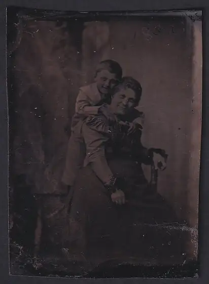 Fotografie Ferrotypie Mutter mit ihrem Sohn im Atelier, Mutterglück