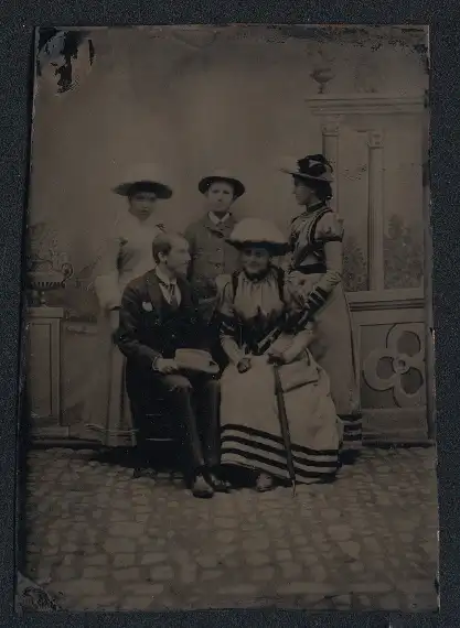 Fotografie Ferrotypie Mutter und Vater mit ihren drei Kindern in Sommerkleidern