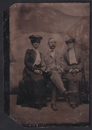 Fotografie Ferrotypie Mutter und Vater mit ihrer erwachsenen Tochter im Atelier
