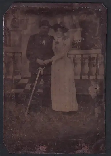 Fotografie Ferrotypie Soldat in Uniform mit Orden und Säbel nebst seiner Frau
