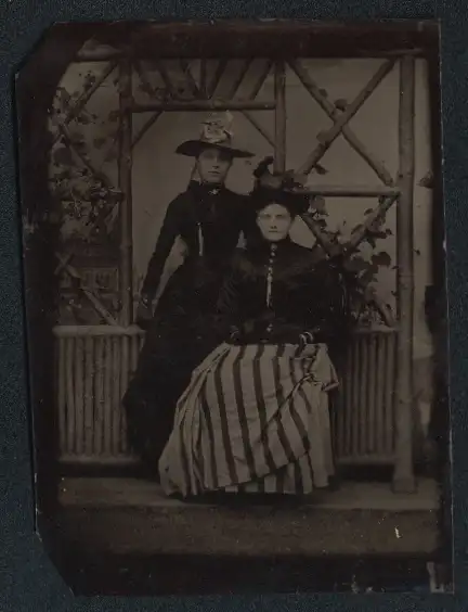 Fotografie Ferrotypie zwei hübsche junge Damen in dunklen Kleidern vor einer Studiokulisse