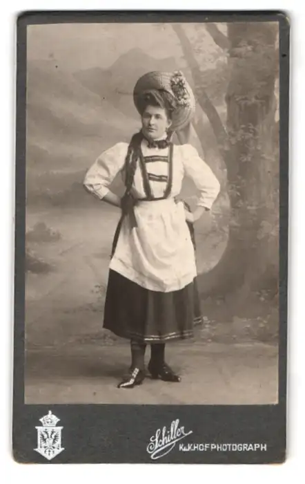 Fotografie Friedr. Schiller, Wien, junger Frau im Kostüm zum Fasching mit langem geflochtenen Zopf