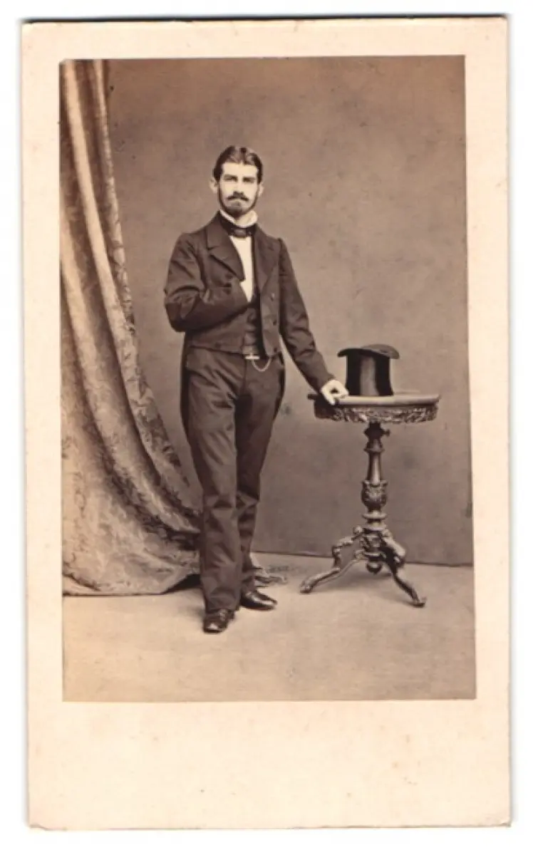 Fotografie G. Völkerling, Dessau, junger Mann im Frack mit Zylinder auf dem Tisch, Mann in Amerika verschollen